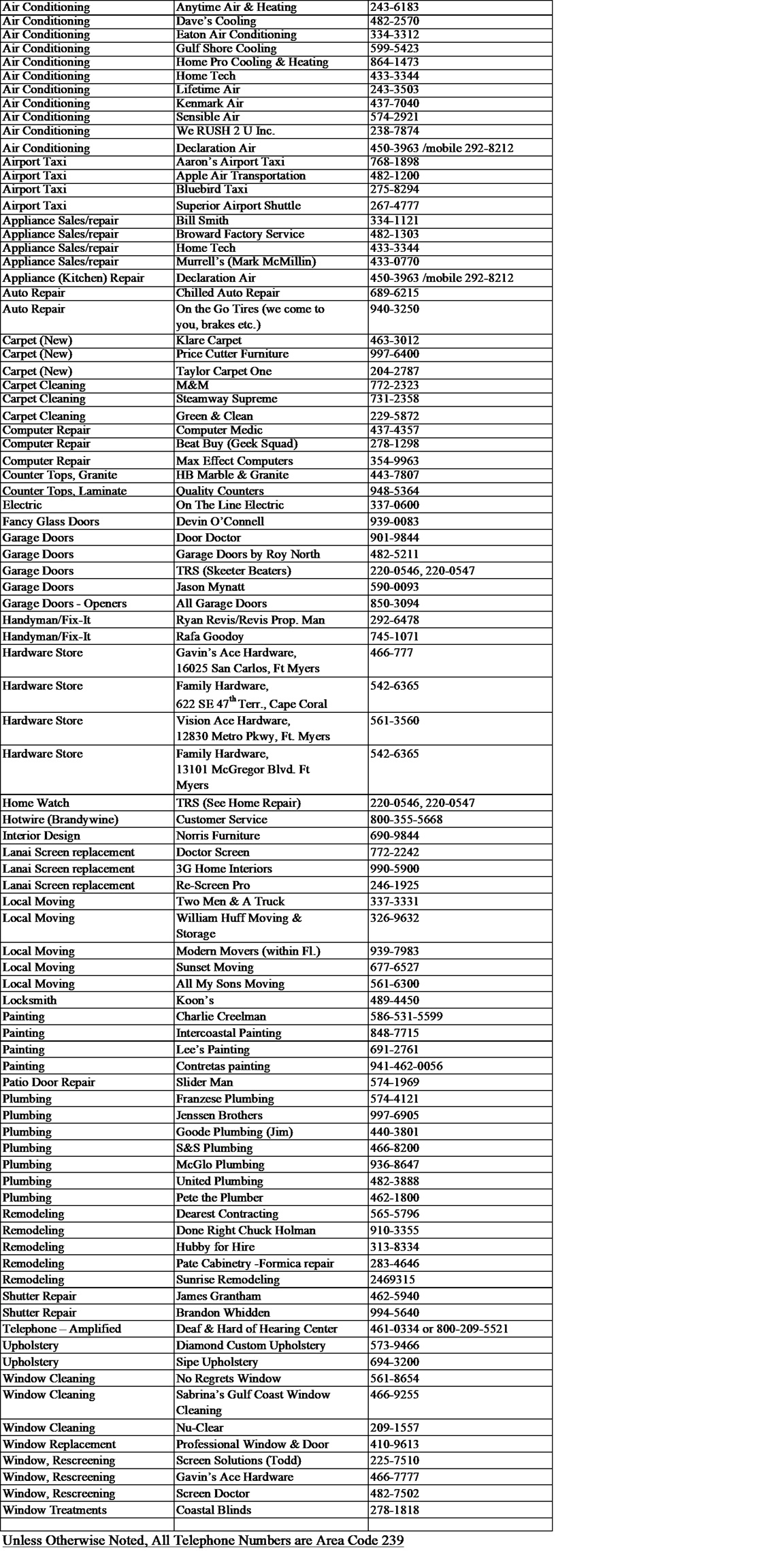 Unless otherwise noted, all area codes are 239.